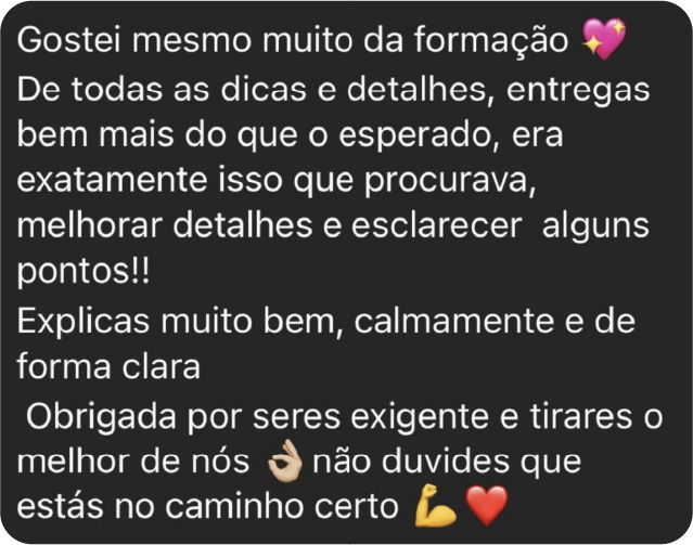 Sim! Após a formação, vais ter acesso a uma comunidade exclusiva no WhatsApp, onde podes esclarecer dúvidas, partilhar experiências e continuar a evoluir com outras profissionais da área de formação e estética.